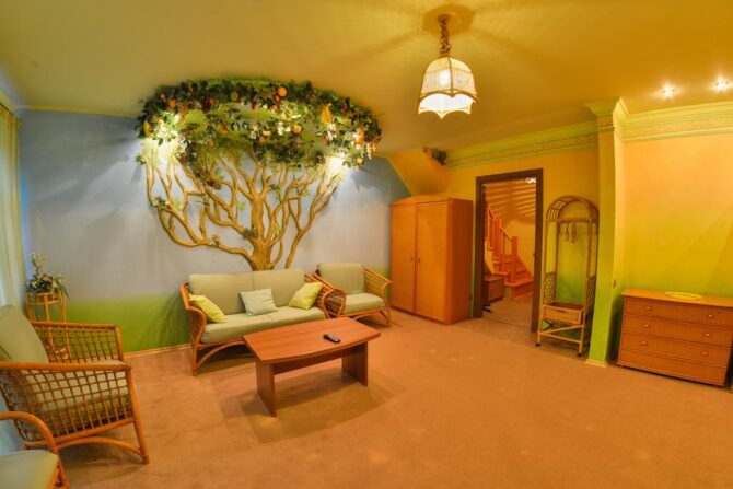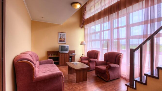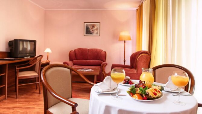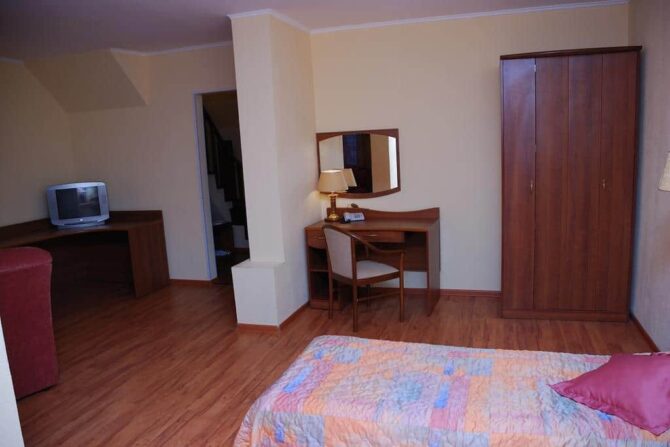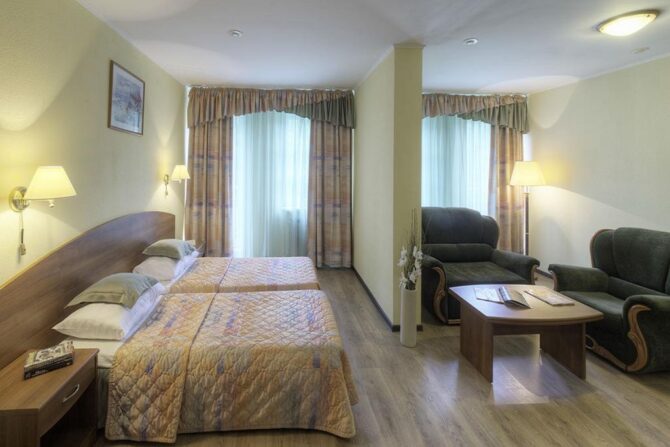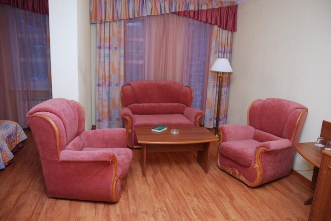 The apartments have everything you need to make guests feel at home and not deprive themselves of everyday habits. Before bedtime, you can watch TV and talk to relatives via video link. Each room has a powerful air conditioner, at any time of the day maintaining the optimal temperature level. A large bed, bedside rooms, telephone, soft area, dressing room, safe, bathroom hairdryer and hygiene products – all this is available even to the guest of standard rooms.