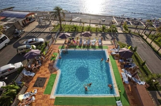 A little further, at a distance of less than 50 m. equipped with a public beach area. All the necessary attributes of a relaxing holiday, in the form of sunbeds, towels and awnings from ultraviolet rays are in sufficient quantities. The spacious coastal area is dotted with the smallest pebbles and dark sand. In the evening hours, the lights of lanterns are lit on the beach adjacent to the hotel and spacious, which give the evening walk romantic notes.