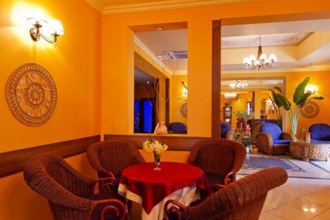 Each of the levels of the hotel complex is decorated, according to the color scheme and quality characteristics of one of the stones, which are attributed to the precious. So, the rooms of the coral level in the interior abound in red-brown shades.