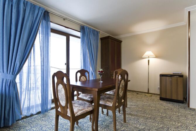 - «PC Suite» – consists of 2 rooms with two balconies. They are furnished with a furniture set that includes a double bed. Plasma screen, refrigerator, safe present. The personal hygiene room has all the necessary options, including a jacuzzi, bathrobes and a set of towels.