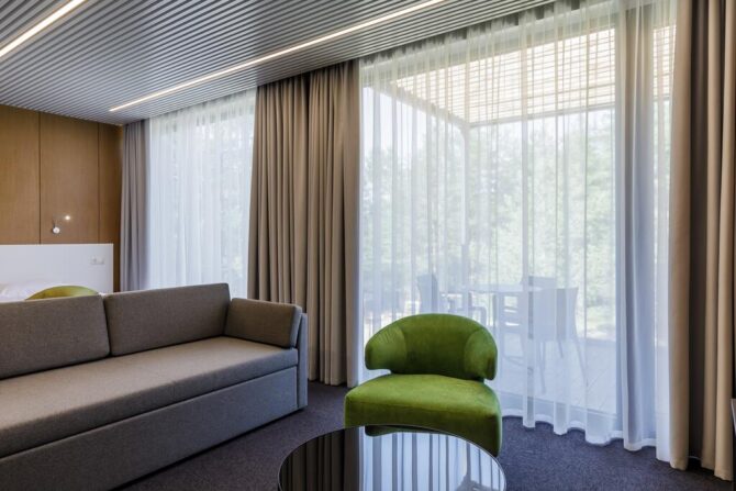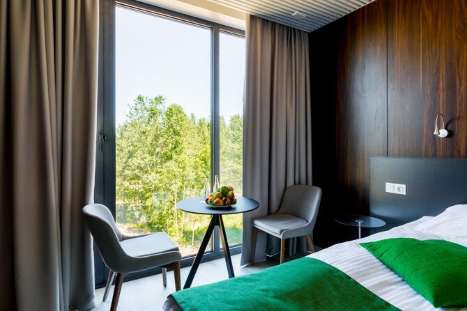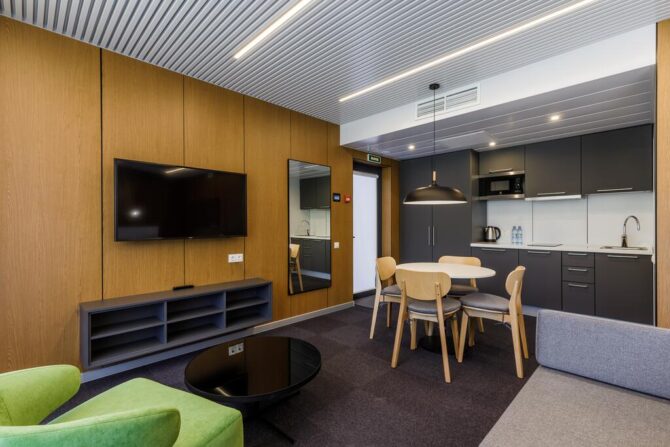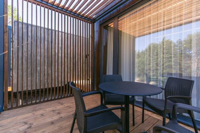 The modular hotel consists of two-storey blocks, each with a separate entrance. There are detached houses, in which there are standard and family studios. The interiors were carefully designed by designers. In the rooms, except for sleeping places, there is always a coffee table and semi-seats opposite the panoramic windows. The rooms have a kettle, safe, bathroom with shower. All rooms have their own entrance.