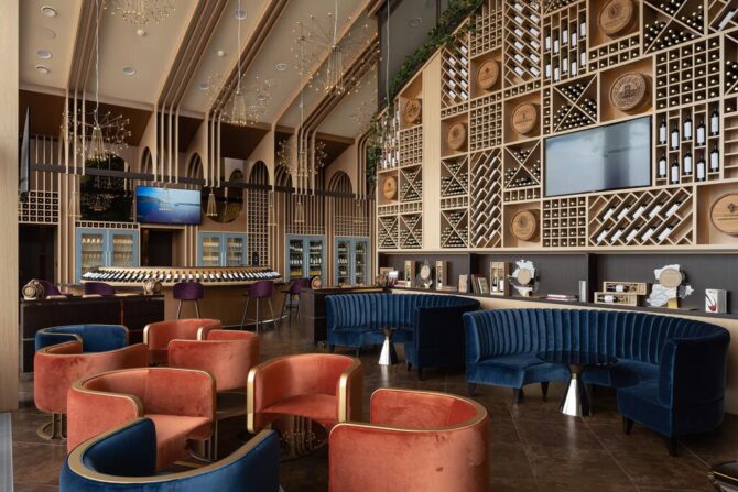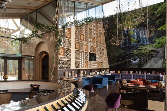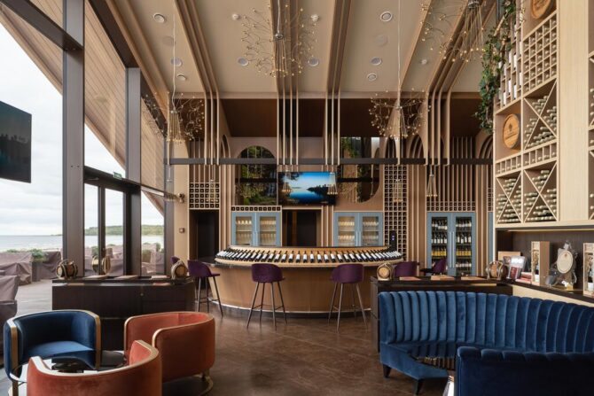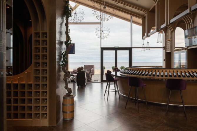 The wine cellar is really an exclusive place on Ladoga for lovers of enotourism. The building is decorated in an unusual architectural form with the most minimalist interior inside. Designers used a spectacular décor that combines huge panoramic windows with wooden elements. On the one hand, the hall resembles a modernized wine cellar, on the other hand, a futuristic art pub room.