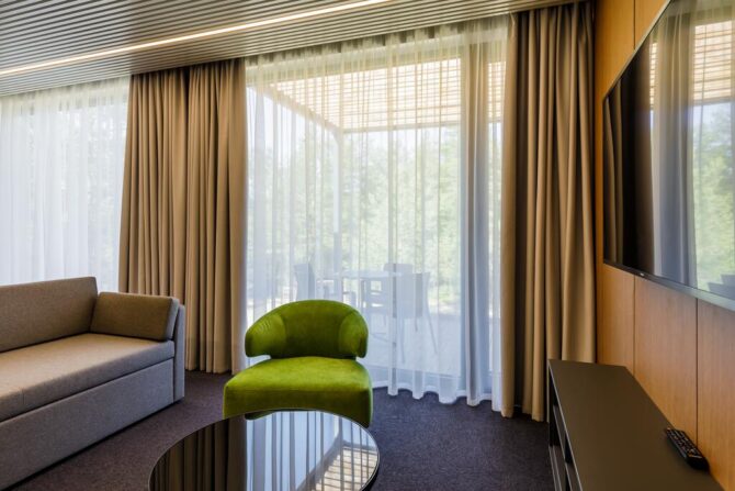 Sports and entertainment equipment rental is available on site. In winter, you can take cross-country skis and explore the surroundings on the paved ski track. In summer, bicycles are available for all family members. Adults can rent Nordic walking poles while children fly a kite (it can be taken for free). In assortment there is badminton, board games.
