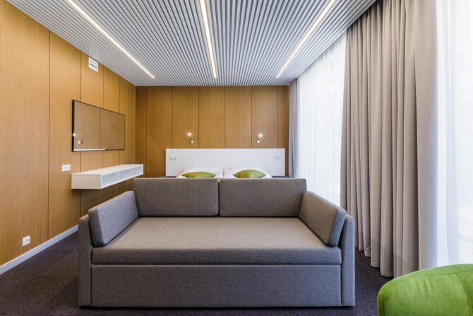 The hotel accepts children of all ages. For younger guests up to 3 years old inclusive, cots are provided free of charge. Starting from 4 years, an extra bed will cost 1700 rubles. per night (prices are valid for February [y]). It should be noted that for a family with two or more children, it is best to book a family studio. This apartment already has a pull-out sofa and can be accommodated with another cot if desired.