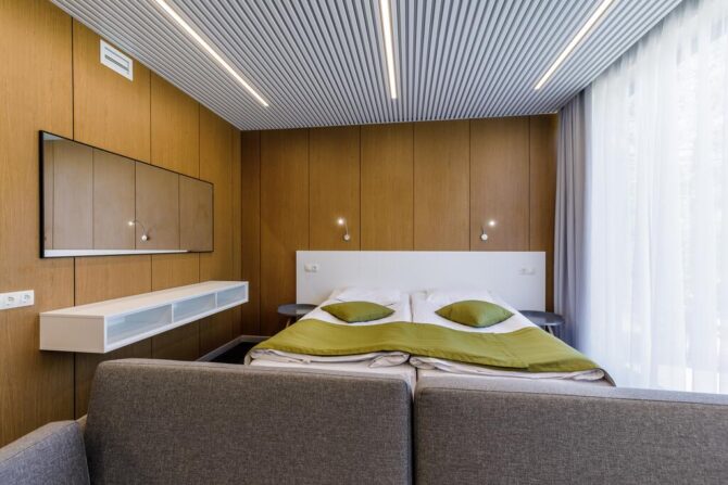 - Standard (available 31 rooms of 18 sq. m. – designed for 1-2 people, one double or two single beds, floor air conditioning, refrigerator, TV with satellite channels. Some have French balconies.
