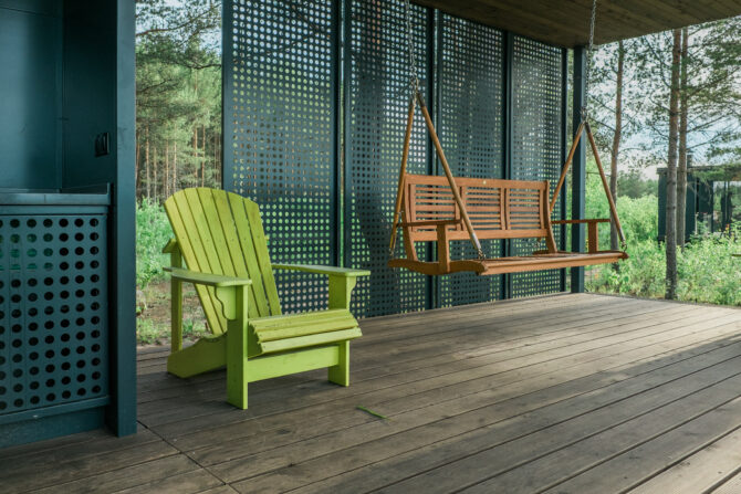 The panoramic living room will be a great place to relax for a large company. Family and corporate celebrations are held here. The owners tried to take advantage of the main advantage of the local nature and created two panoramic piers over the Ouoksa River. From here you can not just admire, but from above contemplate beautiful views. On the piers there are soft sofas, street fireplaces, fences are made of tempered glass.