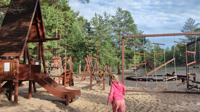 On the sandy shore built an environmentally friendly playground. Swings, slides, carousels, labyrinths, ladders are made of wood, and the site itself is surrounded by Karelian pines on one side, and family studio apartments are located on the other.