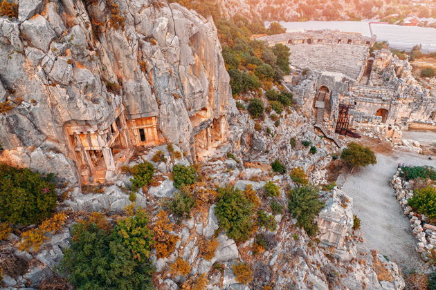 Также вы увидите великолепные, ни на что не похожие и единственные в своём роде скальные захоронения ликийцев которым вот уже как 2500 тысячи лет. Таких захоронений в античной Ликии около 1000, но все они разбросаны по полуострову Теке, некогда территории Ликии. И только в этом месте, в столице Ликии — городе Миры находится наибольшее их количество в одном месте. Соседствуя с огромным амфитеатром, Ликийские скальные гробницы создают атмосферу античной действительности. Также у подножья гор величаво по сей день, в хорошо сохранившемся состоянии находится греко-римский амфитеатр на 15000 человек. Присев на лавочку можно представить, как 2000 лет назад на арене проходили гладиаторские бои, выступали императоры и проповедовали христианские святые. Пор сей день в этом месте сохранилась великолепная акустика.