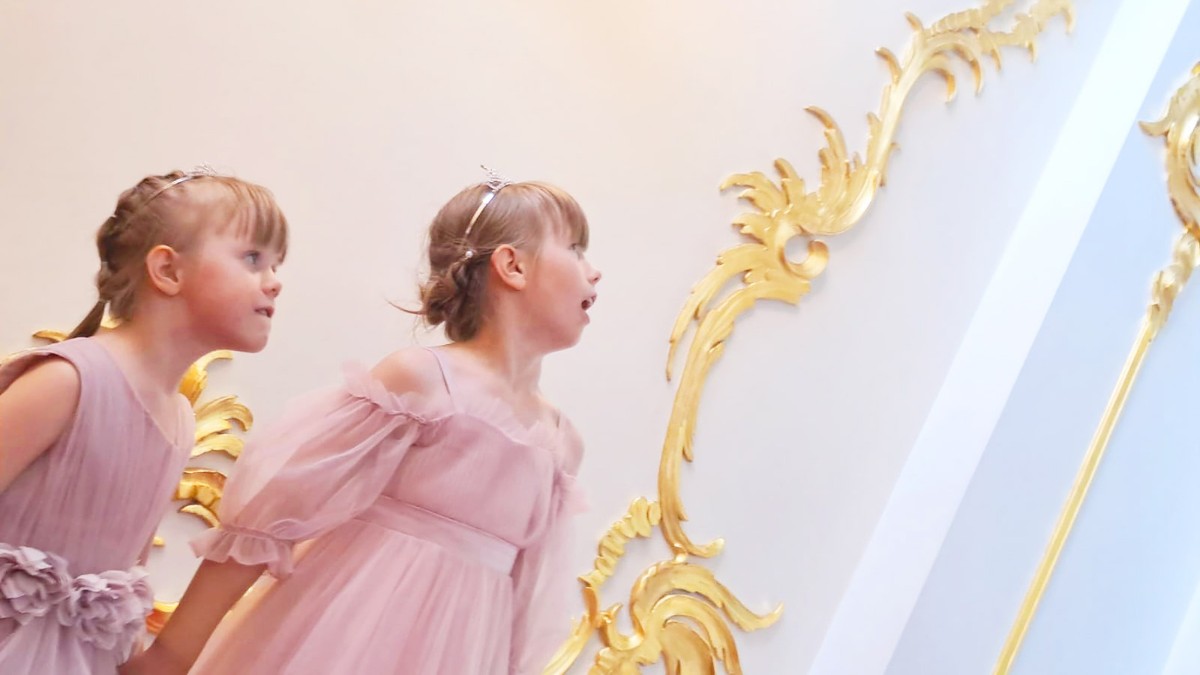 Наше путешествие начнётся с величественной лестницы, где гостей окружает блеск золота и множество окон и зеркал. Присмотримся к окнам повнимательнее и увидим, что некоторые из них — это совсем даже и не окна. Вот как во дворцах бывает! Между прочим, это тоже искусство — Великое Искусство Дизайна.