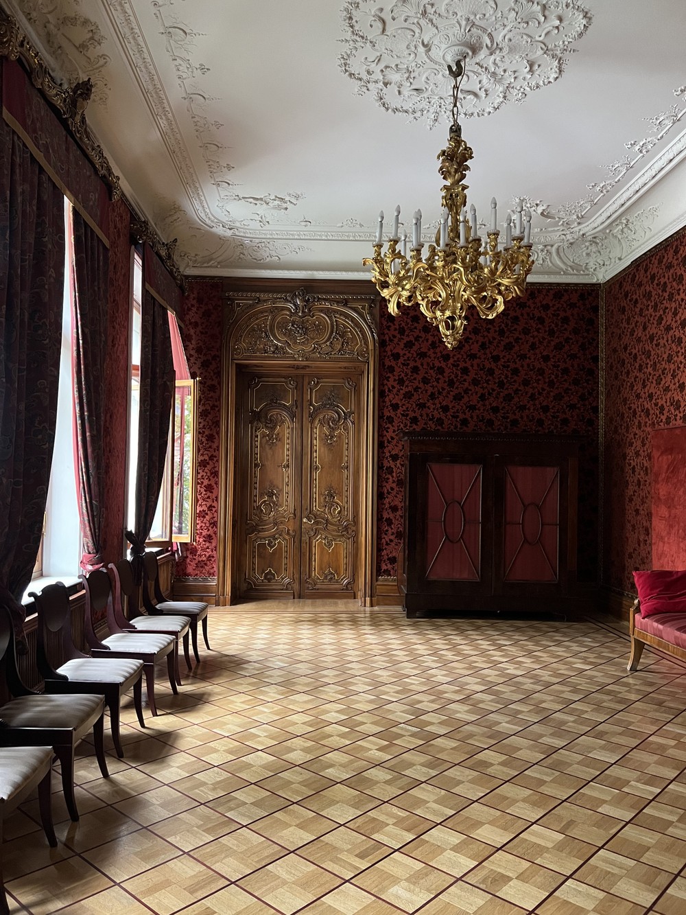 Очень яркое впечатление от интерьеров особняка. Много декора из дерева: шикарная дубовая библиотека и камин в ней из четырёх видов мрамора; оркестровая с отделкой из орехового дерева. Бальный зал с венецианским зеркалом. И, конечно, бронзовый, он же ужинный зал - восхитительно!