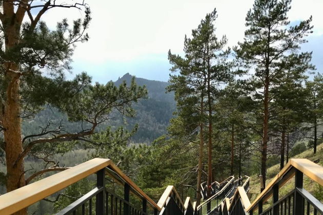 По самой длинной лестнице России мы зайдём на Красный гребень и увидим часть заповедника Столбы, а именно самую красивую скалу Такмак.