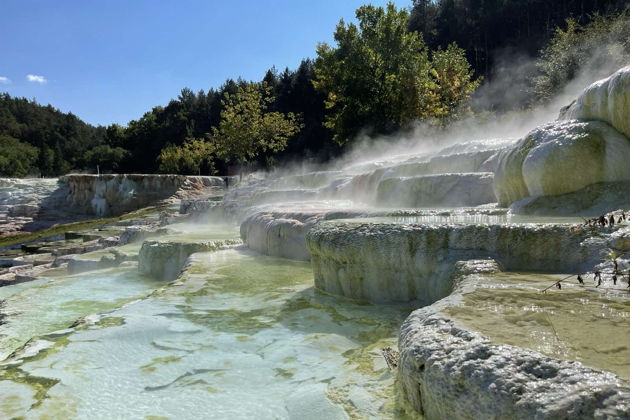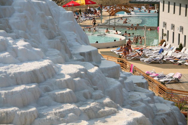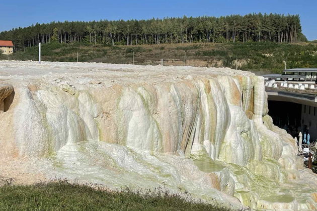 Соль, выделяющаяся из весьма богатой минеральными веществами лечебной воды, непрерывно обогащает новыми кружевами импозантную белую формацию. Лечебная вода с гидрокарбонатом кальция и магния, содержащая также значительное количество натрия получила одну из лучших оценок в категории серных лечебных вод.