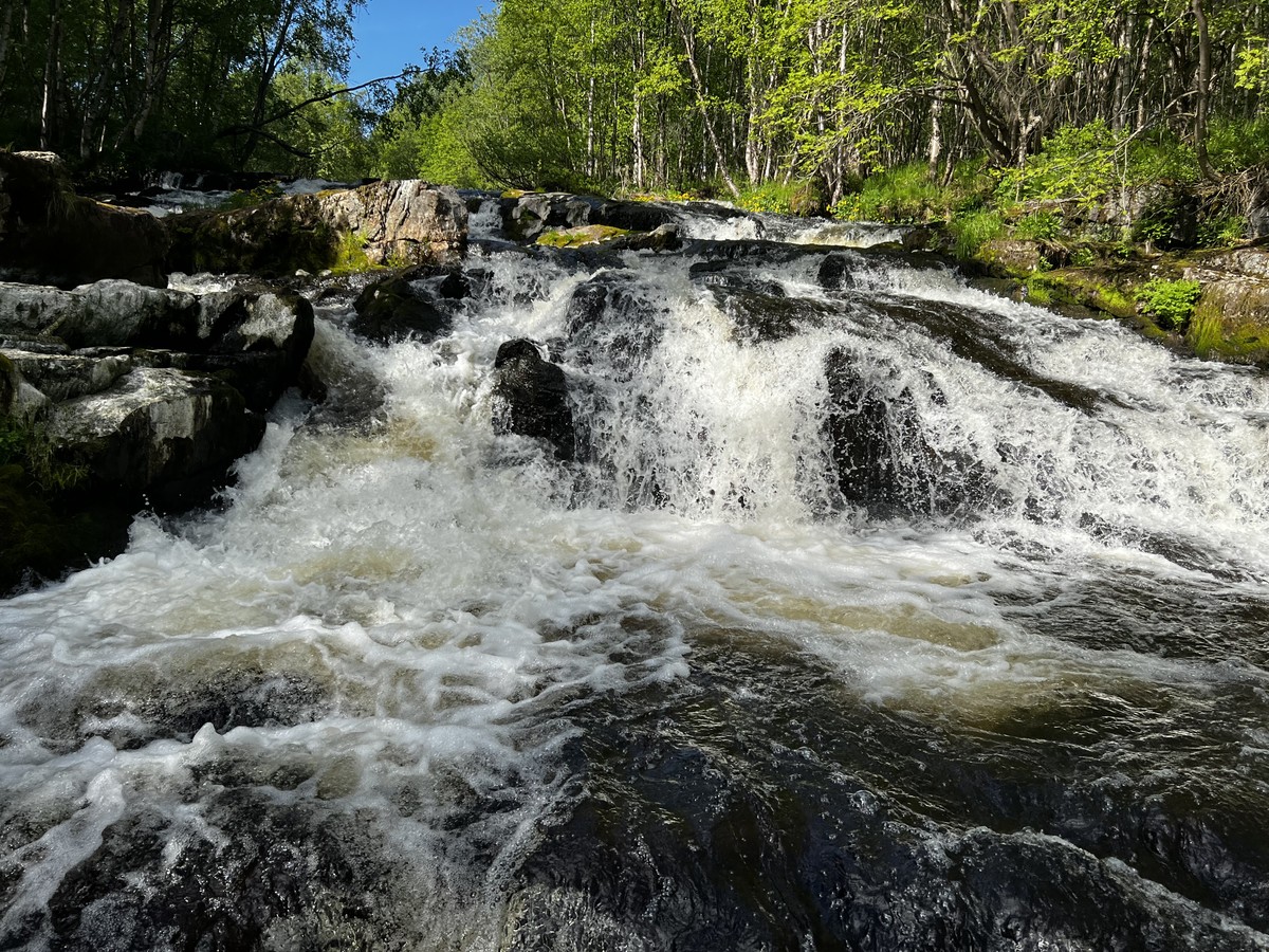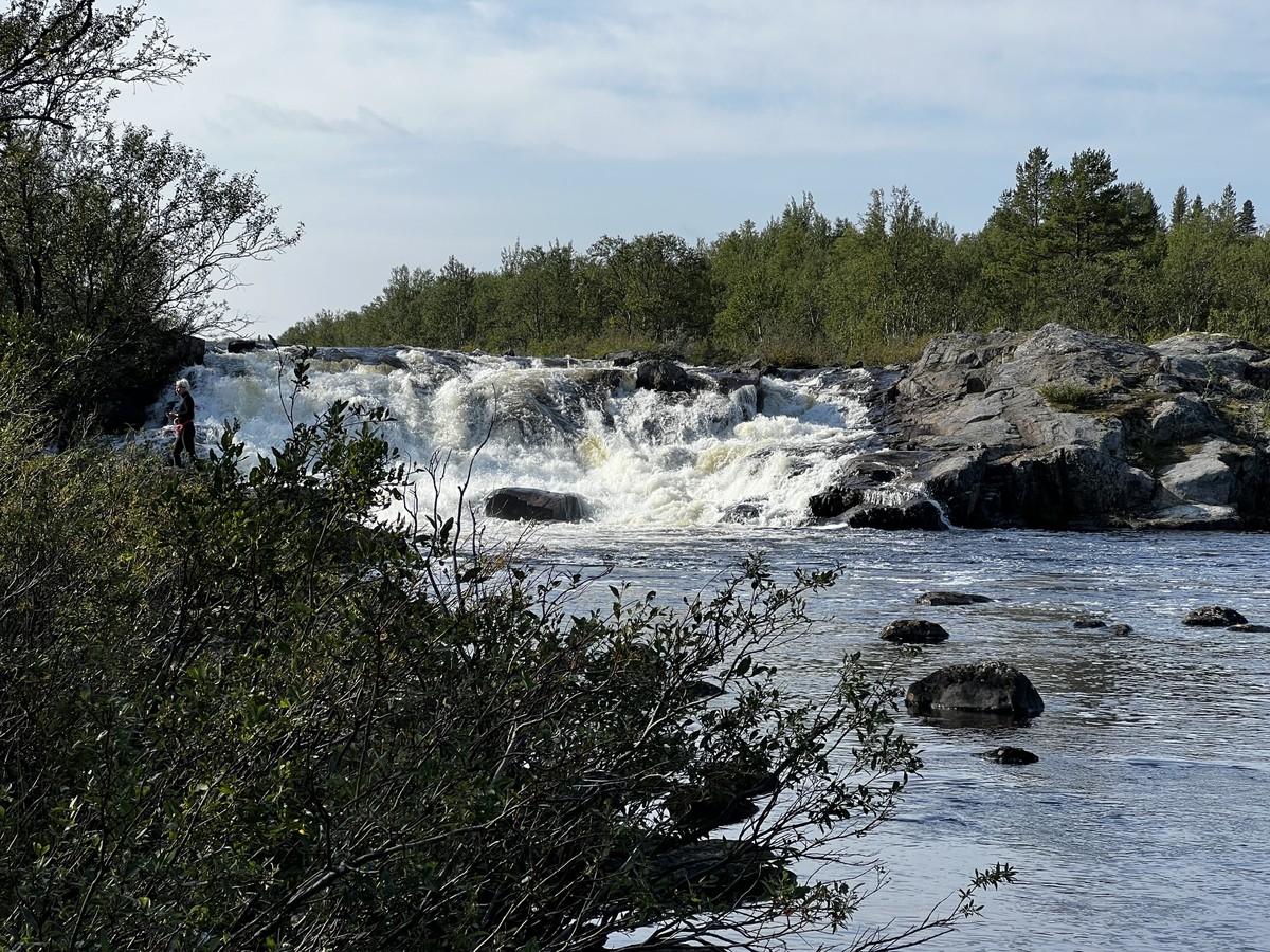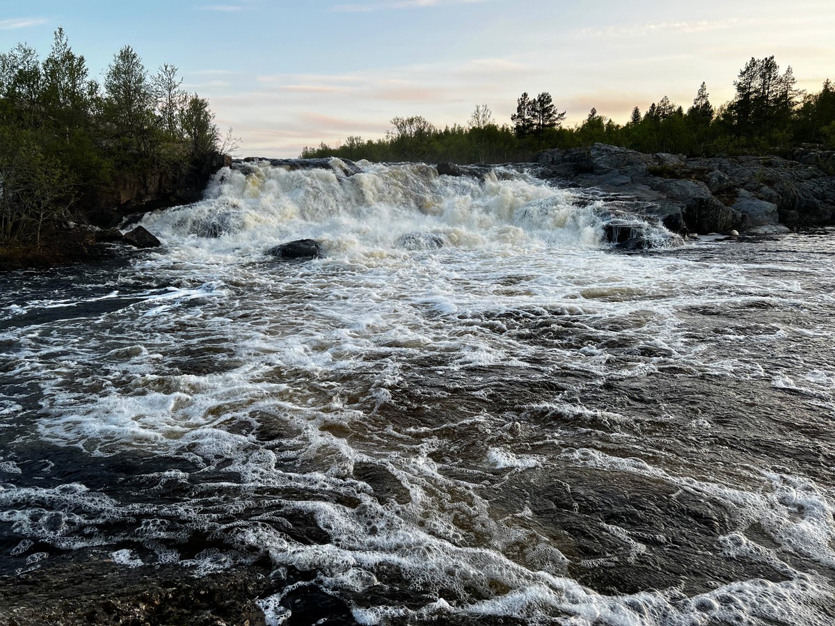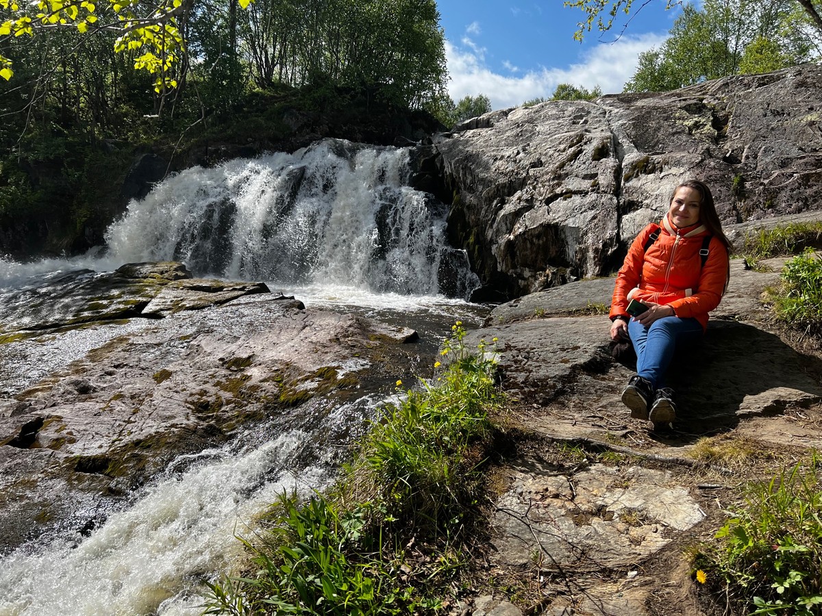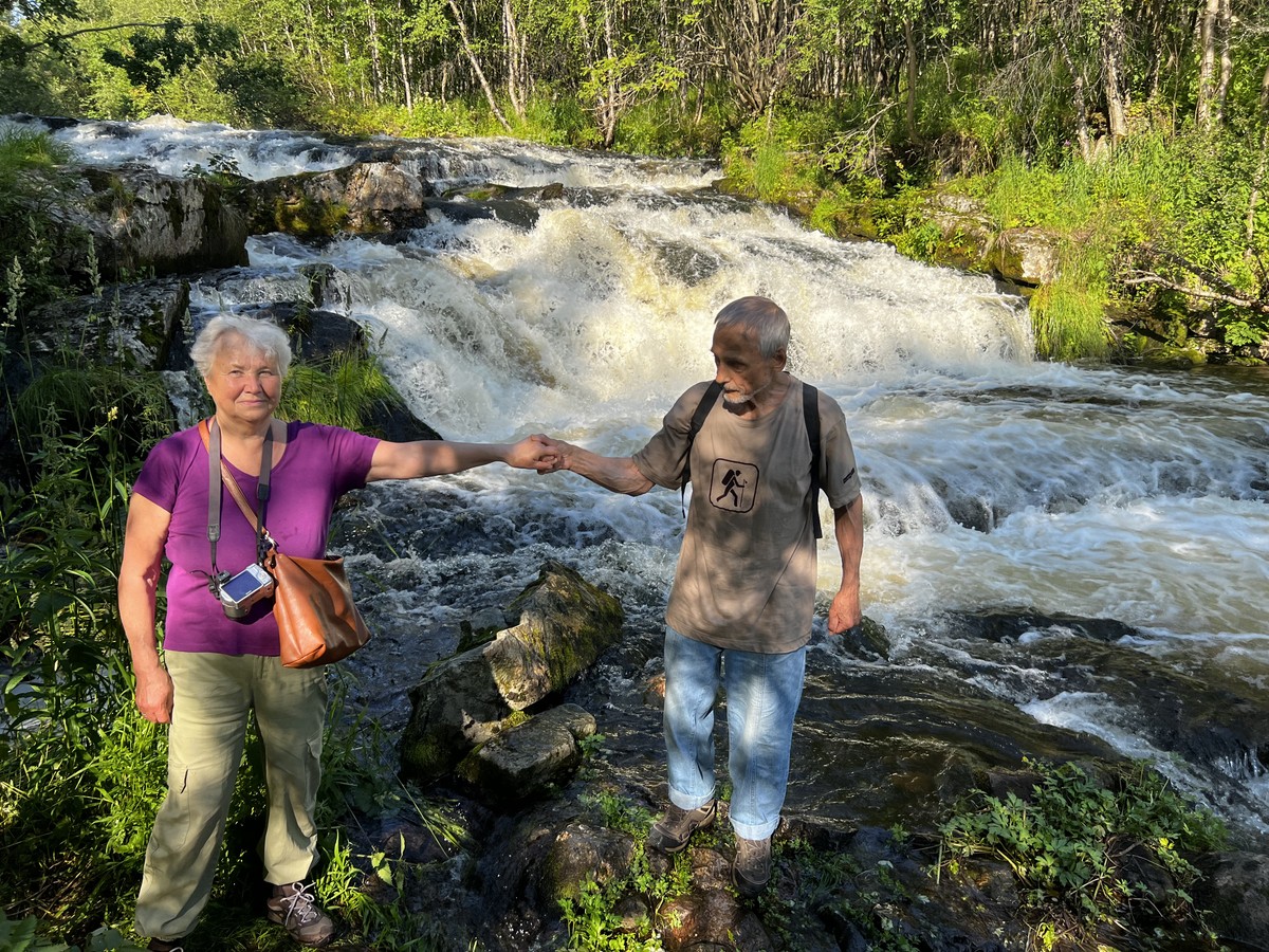 - Водопад реки Ура. Пеший маршрут до водопада (300 м) проходит по лесотундре, богатой грибами и ягодами (тут растут морошка, брусника, черника, вороника). В этой локации мы устраиваем небольшой пикник для наших гостей — стол с чаем и бутербродами. Угощаемся, любуемся бурным водопадом, фотографируемся.