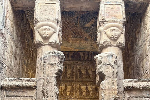 это один из самых интересных храмов древнего Египта ,к которому все правители древнего Египта от фараонов до грекоримских царей уделили большое внимание ,потому что храм посвящён к одной из самых любимых богинь древнего Египта ,богини ХАТХОРА .Хатхор -богиня любви и музыки в древнем Египте .Она считалась богоматери .Хатхор изображаетя в форме корови и женщины с рогами на голове и между рогами стоит солнечный диск.