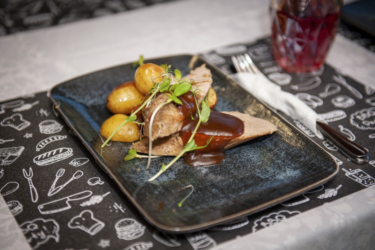- Сет № 2: салат овощной с киноа, медальон из свиной вырезки с картофелем черри и розмарином, булочки пшеничные или ржаные, морс