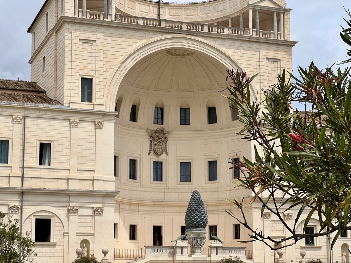 Внутренняя смотровая площадка, откуда открывается вид на сады Ватикана, и знаменитый Дворик сосновой шишки — один из самых фотогеничных уголков Папского дворца.