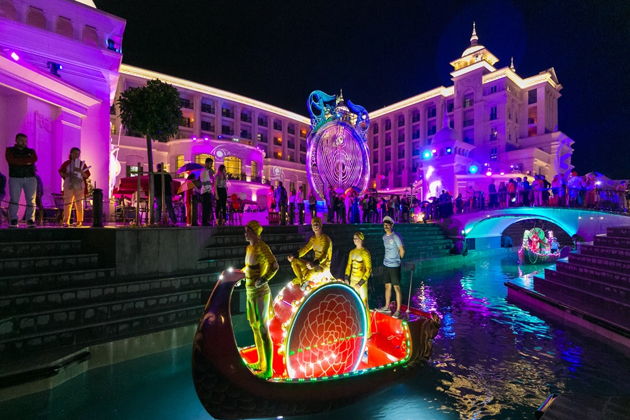 Каждый вечер здесь превращается в незабываемое приключение для всей семьи. Мимо вас будут проходить герои в роскошных костюмах, над головой будут летать акробаты, а сцена на воде будет превращаться то в замок, то в волшебный лес. Дети с восторгом наблюдают за сказочными персонажами, взрослые восхищаются техникой исполнения и атмосферой настоящего праздника. Даже если вы были на этом шоу раньше — нет гарантии, что вы увидите то же самое снова. Программа представления может меняться, ведь все зависит от решений творческой команды отеля Land of Legends Kingdom. Каждый раз — это новое, уникальное шоу.