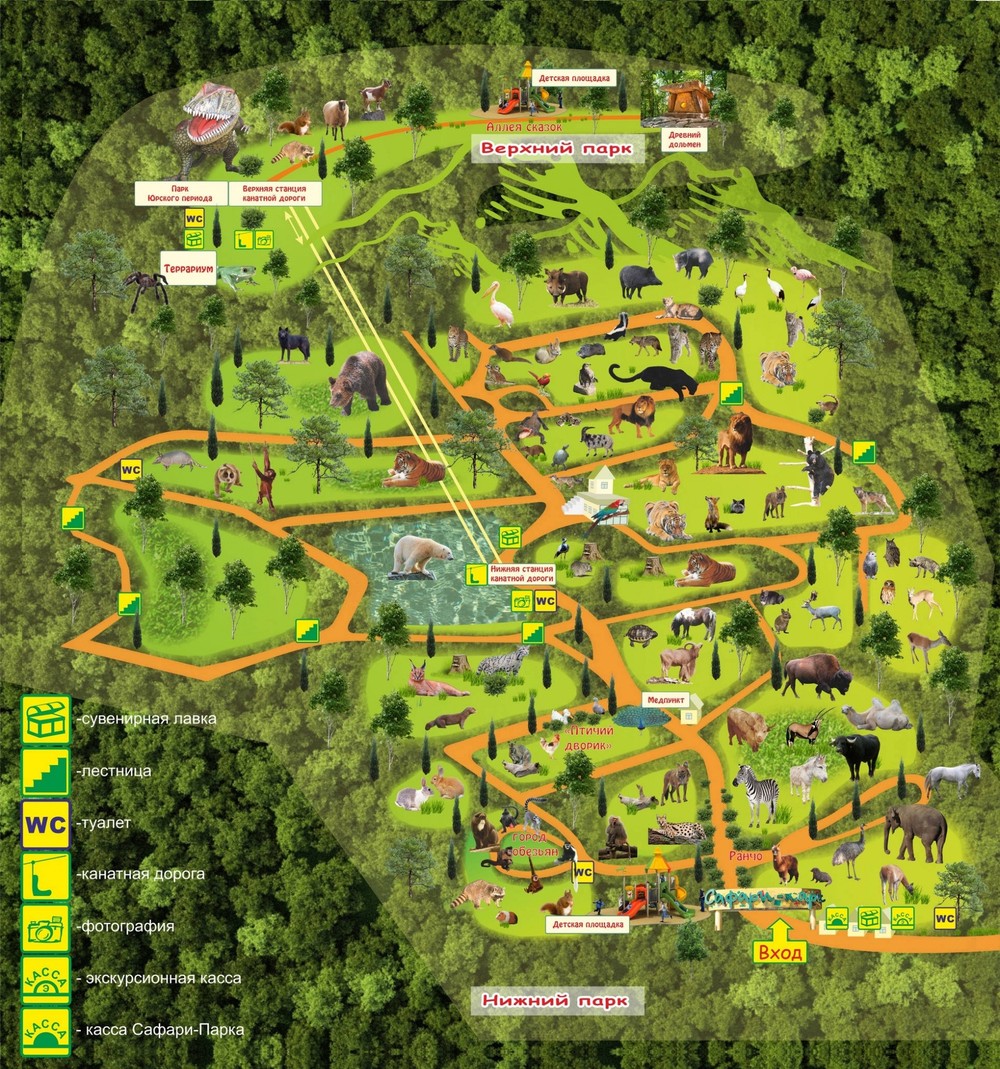 - Побывать в Верхнем парке — самой высшей точке «Сафари-парка». Это горный участок лиственного леса, наполненный запахами растительности и переливами пернатых обитателей