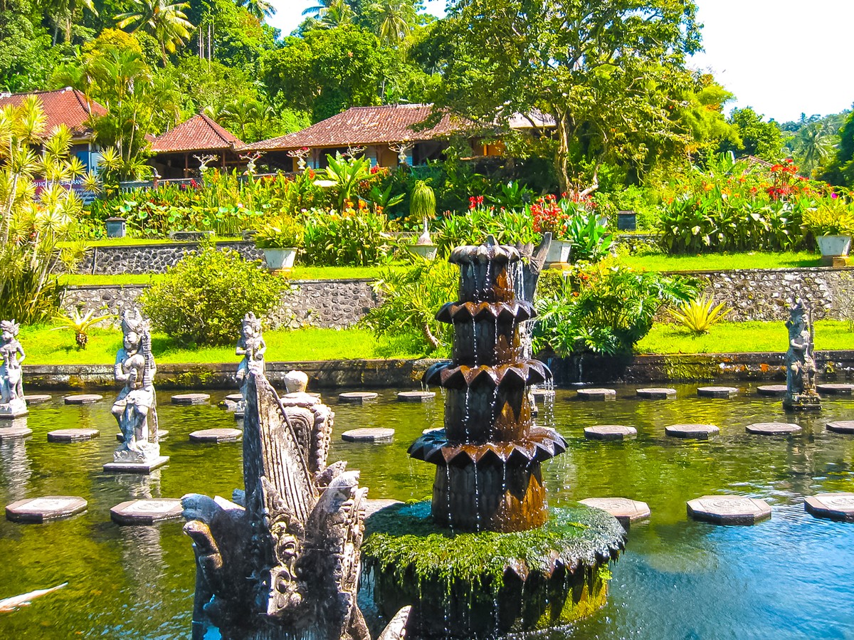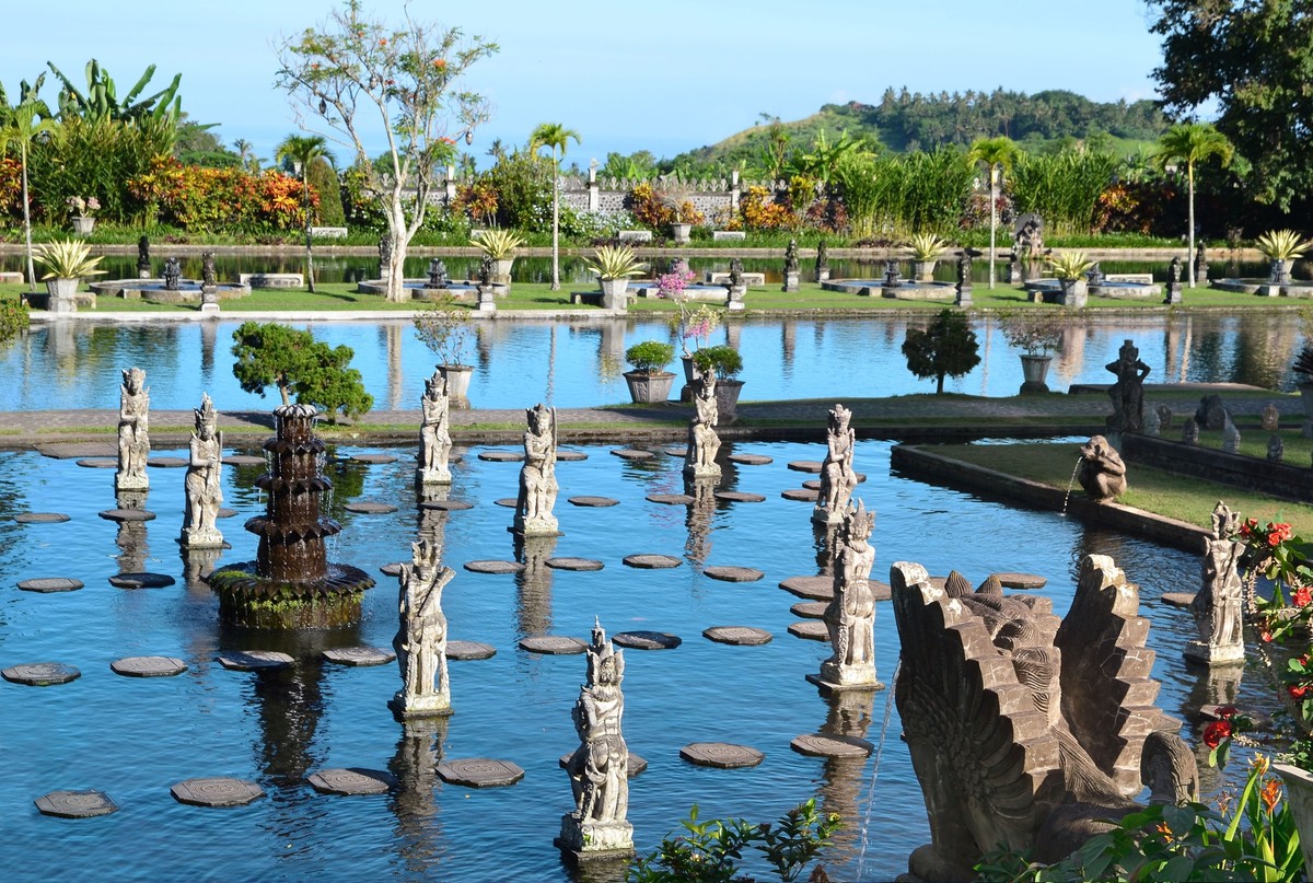 - Водный дворец Тирта Ганга — когда-то он был местом отдыха королей, сегодня радует своей красотой путешественников. Вы полюбуетесь пышными садами и озерами, прудами и фонтанами, каменной резьбой и статуями. Я расскажу, какие интересные события происходили во дворце.