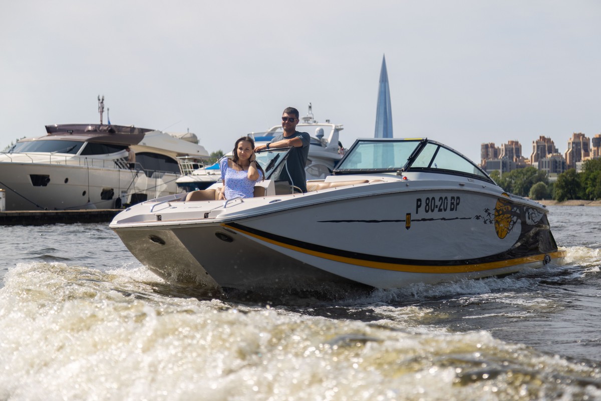 - Водная прогулка пройдёт на комфортабельном катере с кожаными диванами в носовой и кормовой части, столом с подстаканниками, мощной аудиосистемой, биотуалетом и тентом