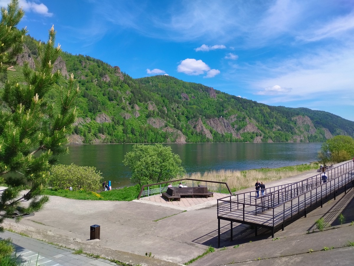 - Следующая остановка — нижняя (туристическая) часть города-спутника ГЭС Дивногорска. Здесь можно погулять по знаменитой набережной под Дивными горами, выпить кофе в популярном кафе, покормить уток.