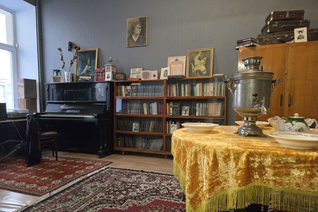 Удивительно, но в Пушкинских горах, где писатель проработал всего несколько месяцев, существует его музей, но в квартире, что полжизни была его домом – нет. Тем не менее, мы все же заглянем в его комнату, где собраны пусть и не оригинальные его вещи, но приближенные к эпохе и создан своеобразный музей советского быта. Во время экскурсии по квартире вы сможете завести патефон, увидите «пластинки на костях» и кровать, пережившую блокаду.