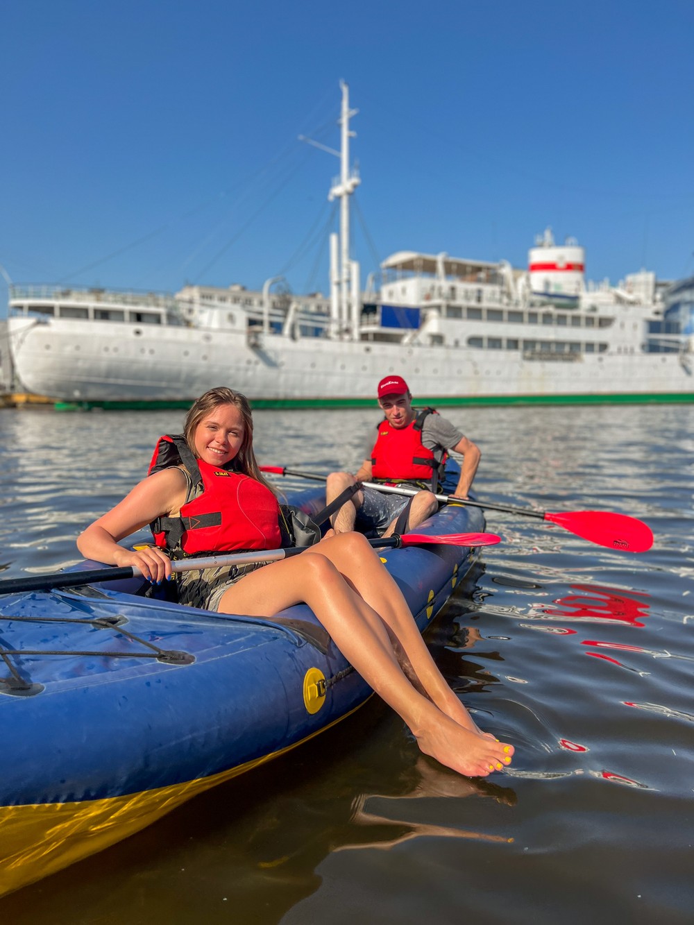 Очень необычный вариант экскурсии по центру Калиниграда, который Вы сможете увидеть не просто с воды, а даже потрогать руками) Особенное впечатление производят корабли музея мирового океана на расстоянии втянутой руки, помогает осознать их масштаб. Экскурсия физически активная, что приятно после обычных экскурсий с долгими переездами на автобусе, хотя и к концу уже устаешь с непривычки. Николай провел инструктаж, выдал всем подходящие по размеру жилеты, вещи которые не хотела намочить оставила в машине, что очень удобно. Сначала было немного трудно сообразить как управлять байдаркой против ветра, но уже минут через 10-15 стало получаться. Я очень рада, что нашла такой прекрасный вариант провести вечер и получила массу положительных эмоций благодаря необычному формату, отличной солнечной погоде, красивым видам.