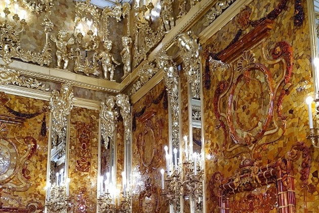 Янтарная комната — шедевр искусства XVIII века, бесследно исчезнувший во время Великой Отечественной войны. Она создана немецкими мастерами для прусского короля Фридриха I, затем подарена Петру I. В 2003 году, к 300-летию Санкт-Петербурга, Янтарная комната была восстановлена в полном объёме (из калининградского янтаря). В настоящее время доступна для посещения в Екатерининском дворце.