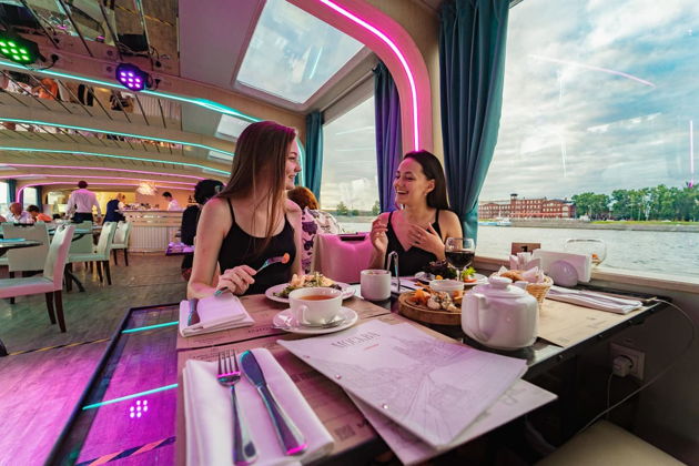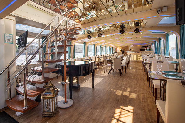 На борту элегантного теплохода-ресторана вы окунетесь в атмосферу роскоши и романтики, отправляясь в незабываемое путешествие по живописным водным просторам Северной Столицы. Наблюдая за проплывающими мимо пейзажами через панорамные окна теплохода, вы почувствуете настоящую магию мгновения. Уютное мерцание свечей, живая музыка и волны за окном создают идеальное сочетание для романтического отдыха или приятного вечера в компании друзей и близких.