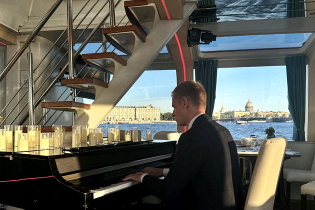 Вечером главный салон теплохода превращается в уютный музыкальный уголок. В центре внимания роскошный рояль, за которым пианист исполняет произведения классической музыки, джазовые импровизации и популярные мелодии.