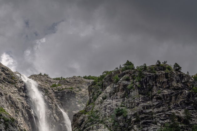 Из леса тропинка выведет к деревянному мосту над крутым перекатом реки Долры, впечатляющей мощью своего потока. За мостом домик пограничников, Россия практически в километре за хребтом, но наша цель — водопады. Впереди самый сложный участок пути по каменной россыпи скальной породы практически в 40-градусный подъем. С тропы на подступах к водопадам открывается прекрасное зрелище на водопады, но еще более впечатляющий вид на долину Долры, Мазери и Сванский хребет. Ничего кроме природы, ничего кроме головокружительных видов, но какие они! И так приятно смотреть и понимать, что до тебя редко кто видел то же самое.Тропа приведет к самому правому и небольшому водопаду, всего их четыре. Здесь мы поднимаемся на высоту 2300 м. Подходить к остальным водопадам рекомендуется при наличии специальной обуви и навыков, так как дорога идет поперек крутого уклона с неустойчивыми каменными глыбами и обломками горных пород. Ужин. Ночь в Местии