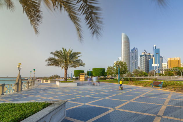 Набережная Абу-Даби (Corniche) — живописная прогулочная зона с панорамой на залив, пальмы и городские пейзажи.