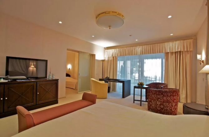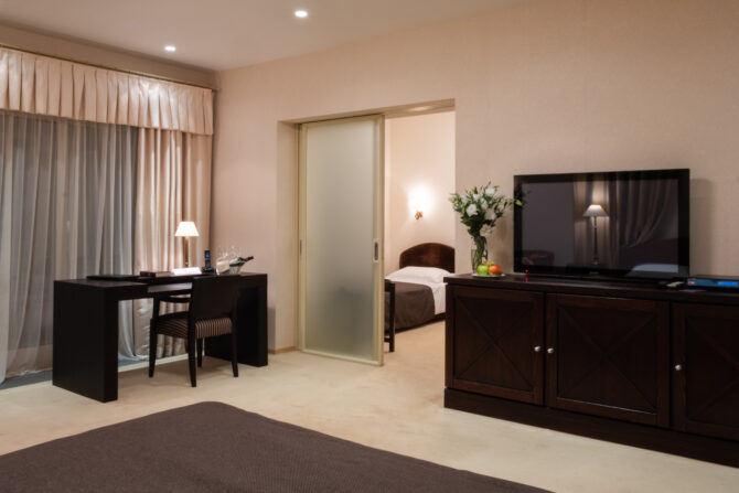 If necessary, hotel guests can ask employees to install additional single beds: one – in the “studio”, two – in other categories. The surcharge will be from 2400 (low season) to 3900 rubles (high season). The equipment of the hotel rooms, regardless of the category, meets the modern standards of European hotels: