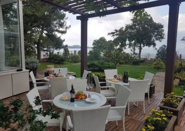 The area around the hotel is a cozy garden, where lush shrubs, coniferous and deciduous trees grow. A compact seating area with tables is available. Each of them has four comfortable chairs with high backs. From here you can clearly see the crowded embankment.