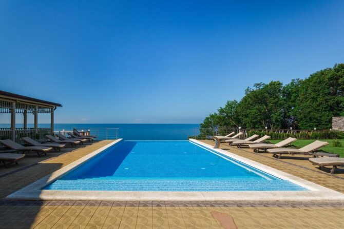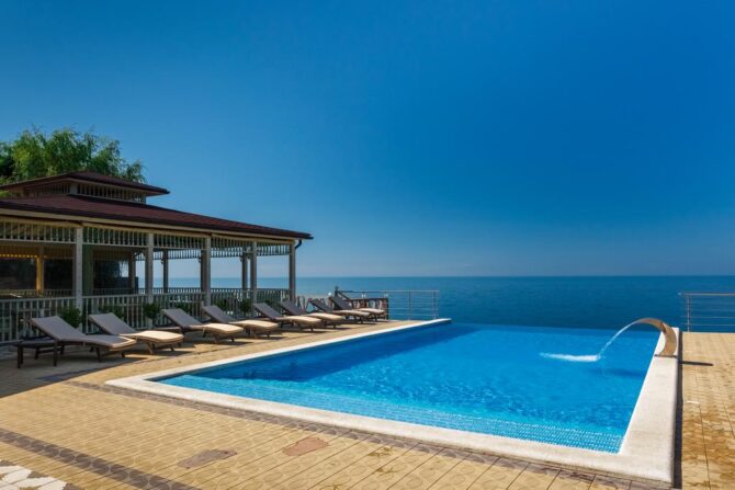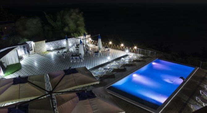 It features a private pool with sun loungers overlooking the sea. And if you walk only two hundred meters, you will get to the convenient pebble beach of the hotel, located in a small bay. The beach is open only to guests staying at the hotel, so you can not worry that someone will disturb your secluded holiday. There is a large free parking area on site.