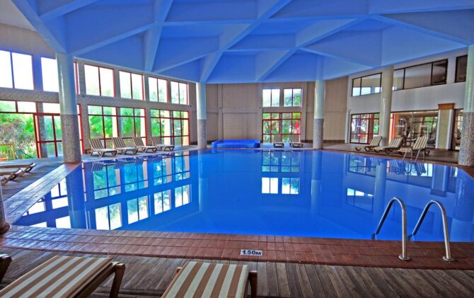 There are four swimming pools on site. Three open: one central large, one medium with a “waterfall” and medium classical shape with a “jacuzzi” (located in a quiet place). There is also an indoor pool, but it is not popular because of the lack of opportunity to sunbathe. Near each there are many sun loungers and other attributes (umbrellas, mattresses, tables). If you do not sleep until 10 am, you can always take a seat. For children there is a separate pool with an animator. There is also a water park with two slides. Quite extreme, as for a person who has been to large water parks.