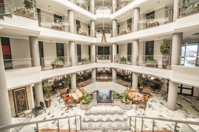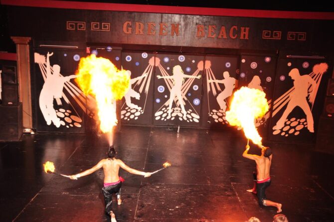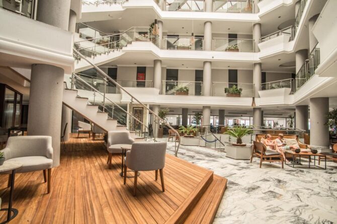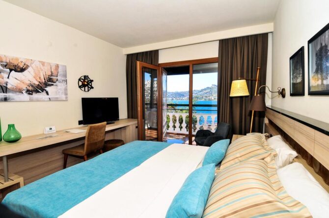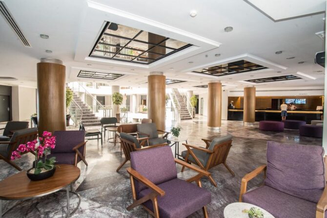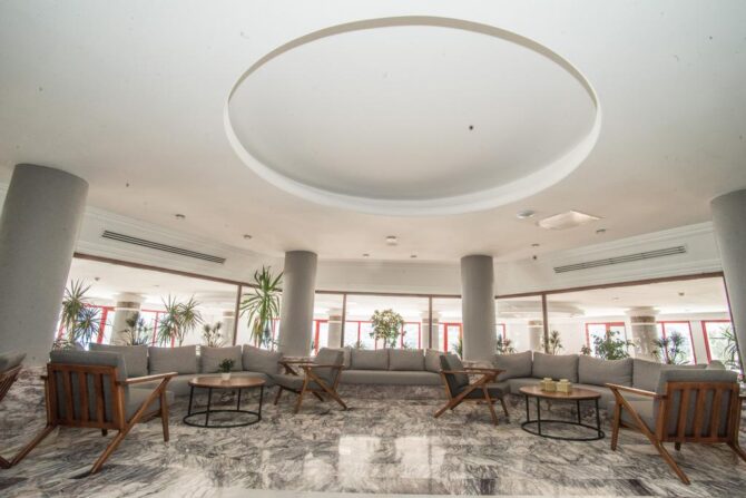 The hotel enjoys a picturesque location, directly on the Aegean Sea in a beautiful lagoon with many yachts and boats. At night, there is a breathtaking view of the neighboring peninsula with resorts and houses on the coast, which is about 400 meters away. Descent to the sea is possible along numerous paths, as well as by elevator of the hotel. The territory is quite mountainous, so before the trip you should prepare for constant descents and ascents. The area of green Beach Resort is so large that you can only get around all its corners in a day. The central building is located on a hill, and small three-story bungalows are scattered compactly throughout the territory.