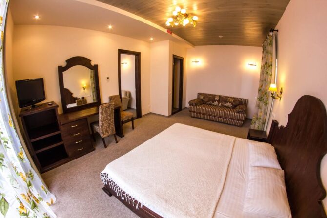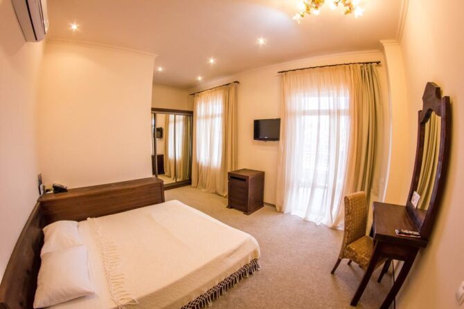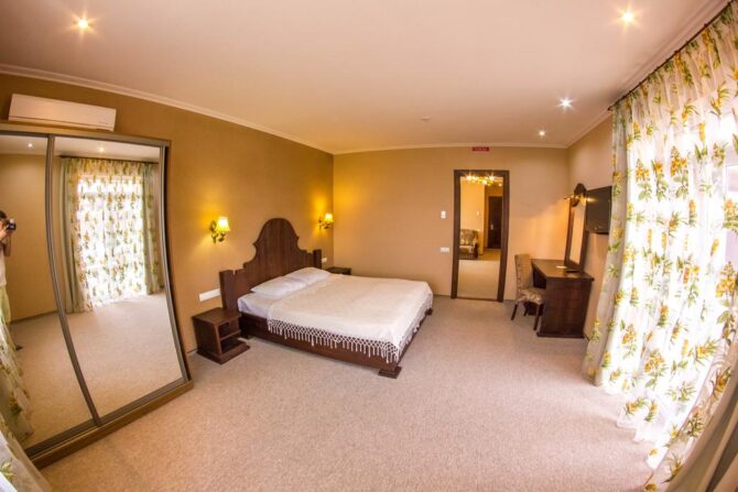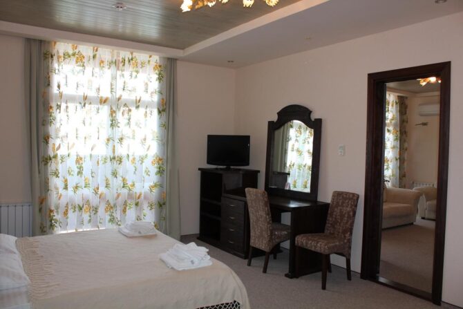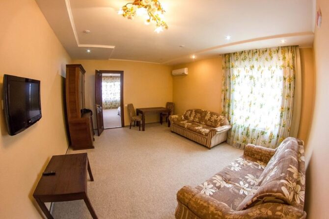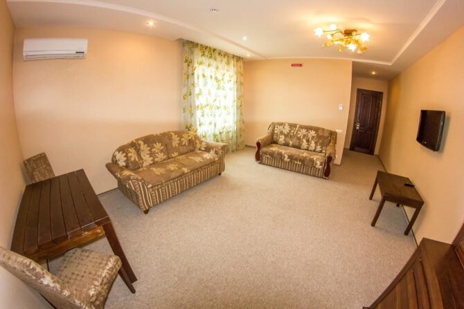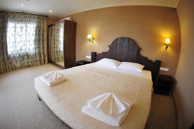 In the hotel fund there are rooms of different categories of comfort. They are located in two buildings with elevators. In 2017, for the high level of service and professionalism, quality of service and reasonable prices, the hotel was assigned a level of 4 stars. All rooms are equipped with air conditioning, TVs, refrigerators and kettles. There is a set of dishes, a safe, an iron and a telephone for internal communication. The bathroom has a shower. An extra bed can be installed everywhere. Wi-Fi is available throughout the hotel.