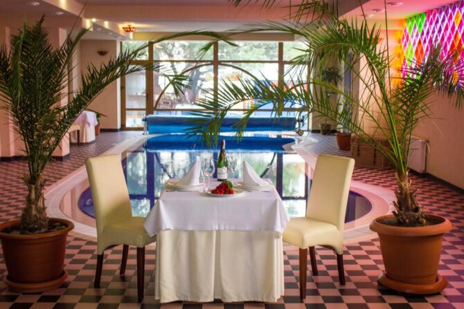 There is also a restaurant, a bar-grill and a sports bar on site. The kitchen specialises in European dishes. The chef cares not only about the taste of the food, but also its appearance. Decorating dishes with greens, sauces, pieces of vegetables or fruits gives them a delicious design. All additives emphasize the natural taste of the product. The assortment always has fresh Black Sea fish, cooked in different ways (boiled, stewed, fried, baked).