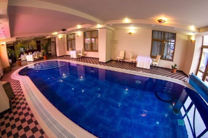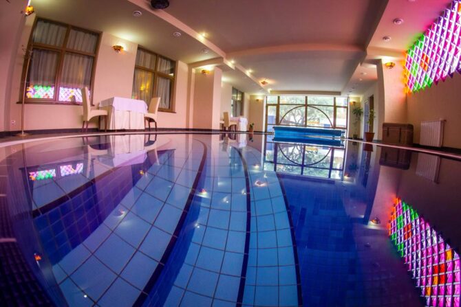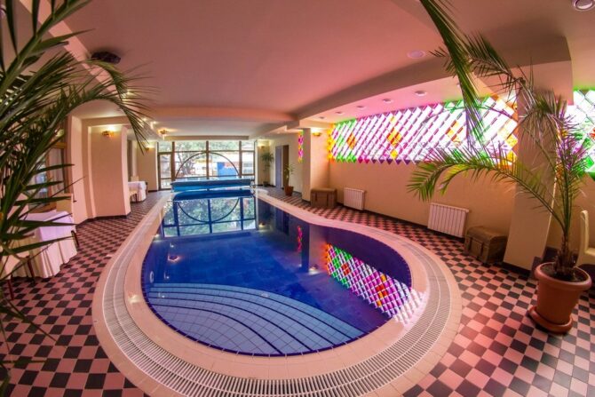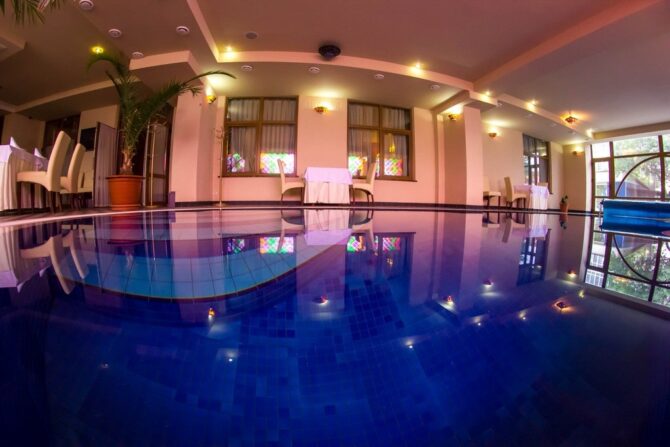In Sudak Bay there are rarely large waves and winds. Therefore, the swimming pool, which is equipped in the hotel “Astarte” on a very large and located in an indoor area. It is used when they stay in the hotel and sunbathe on the terrace of the 3rd floor or after bath procedures. To enter the water there are convenient steps.
