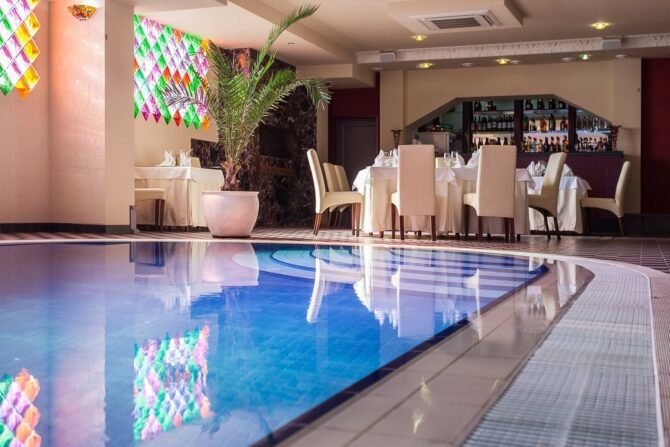 A sports bar is located in the hotel’s billiards club near the pool. Light snacks are served here and a large selection of elite spirits is always available. Grill-bar with a viewpoint is located on the roof of the hotel. There is also a barbecue area, where the cook on an open fire will cook the ordered meat or vegetables on the grill. If guests want to make a barbecue on their own, they will be given this opportunity.