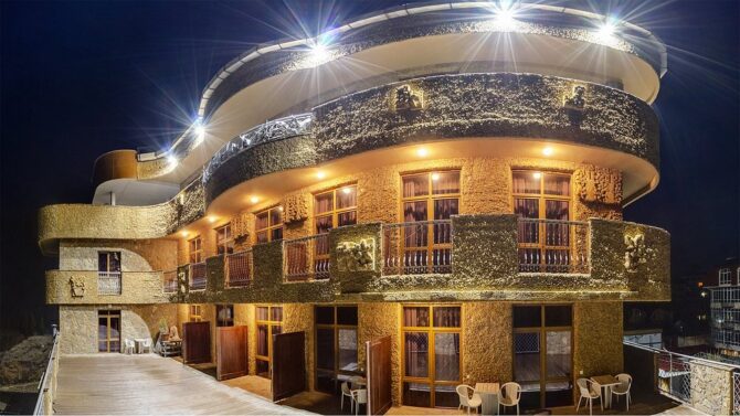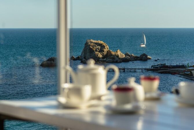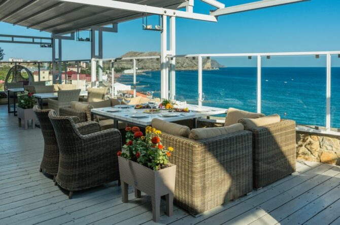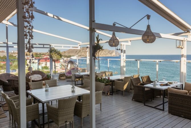 In the Middle Ages, a Genoese fortress was built here – a powerful fortification, which today is included in the list of historical sights of the Crimea. At the foot of the mountain, on which the fortress walls rise, there is the hotel “Astarte”. It was built in 2012. Even outwardly, it is somewhat reminiscent of an old reliable citadel. But behind its powerful walls of sandy color, guests will find far from ascetic interior furnishings.