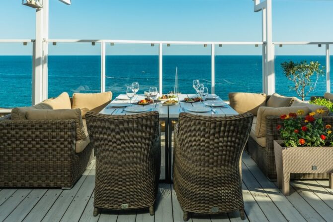 - Premium Suite (60 sq. m.) is located in the 1st building on the 5th floor. Each room has a private terrace with a trampolog, table and wicker armchairs. It offers panoramic views of the sea and the local landscape. The main places – 4, perhaps another additional in the form of a euro-folding.