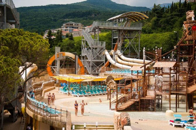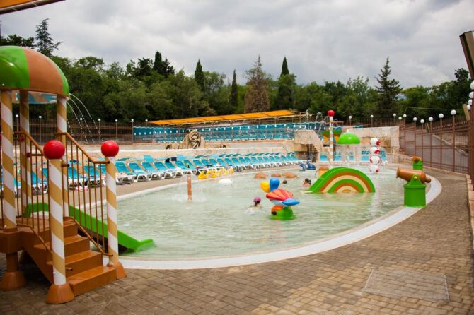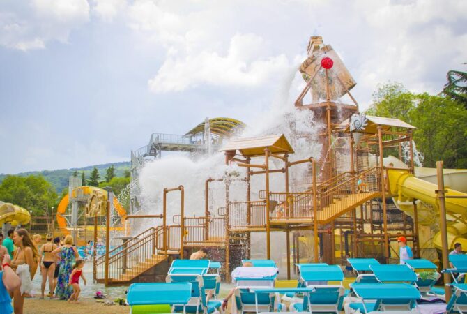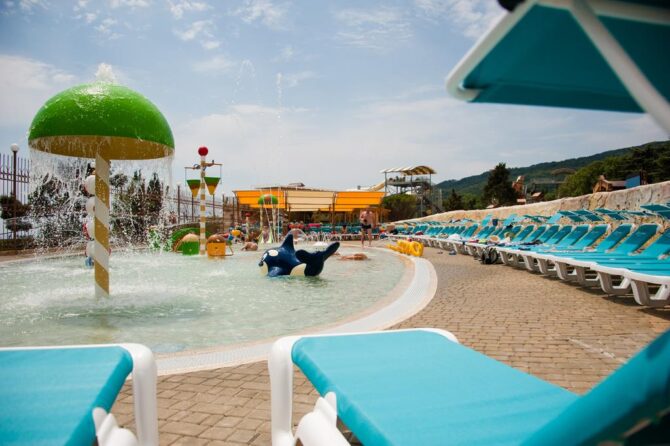 The hotel was put into operation in 2015. It is assigned a comfort level of 4 stars. Guests are accepted all year round. The water park is open only in high season from the beginning of June to the end of September. All infrastructure facilities are located on an area of 15 thousand square meters. m They include an administrative building with hotel rooms, a restaurant, a souvenir shop, playgrounds for sports and children’s games, a water park with attractions and swimming pools, covered parking.
