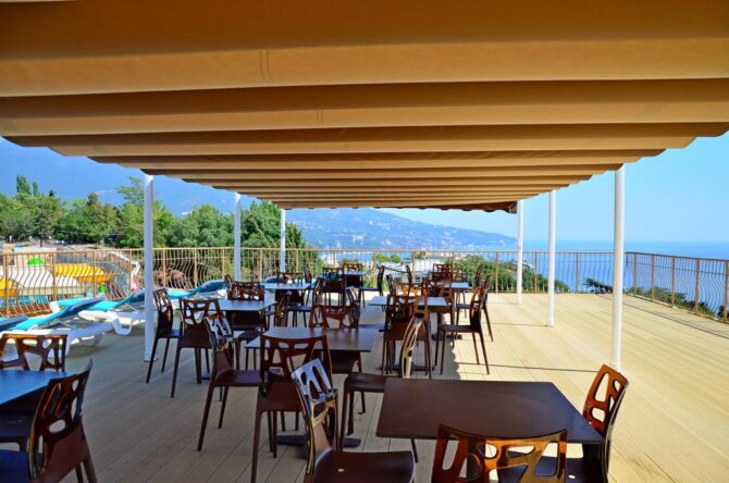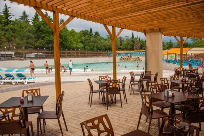 There are several catering establishments on site. Upon check-in, you can purchase a buffet breakfast package. But usually here they prefer to eat on the menu. The main restaurant opens at 8 a.m. It offers three types of menus: gastronomic from the chef, children’s and pizza. The restaurant is considered a must visit for lovers of gastro tours. Visitors are offered dishes of the Black Sea cuisine in the original version. Pizza is baked according to traditional and author’s recipes. Children’s food has an interesting design.