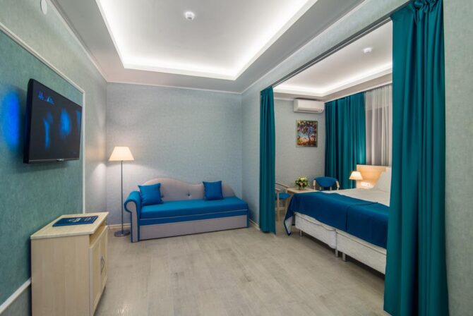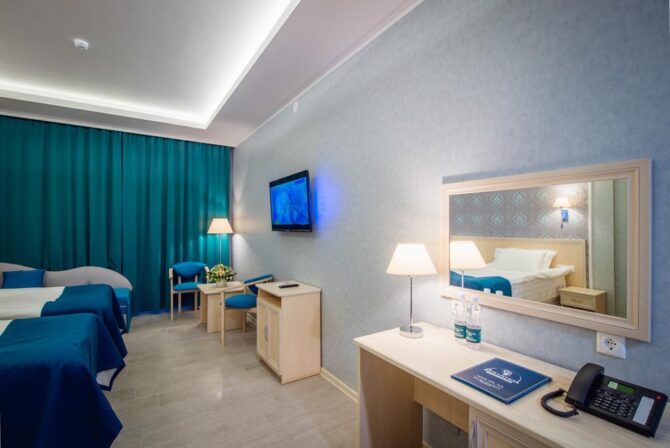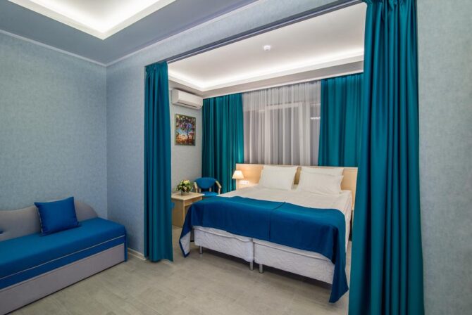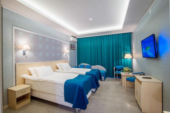 In the hotel fund – 40 rooms of 3 categories of comfort. Each room has its own balcony with seating furniture. The windows overlook the sea or the water park. The rooms are decorated in a marine style with a predominance of blue, green and beige colors. The windows are not panoramic, but large. There is a combined bathroom. Wi-Fi is free.