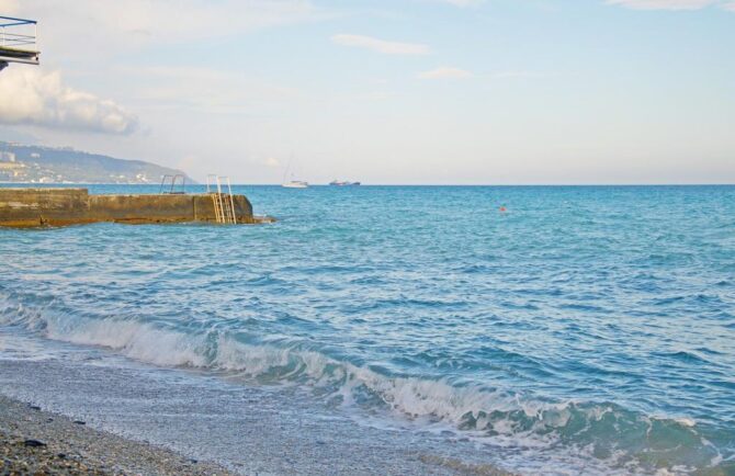 On the beach there are children’s trampolines and water attractions. There are toilets, showers, changing cabins. Massage services are available. There is a paid service area. These are shady bungalows for 2 or 4 people. The promenade from which the beach begins is very clean. You can walk on it barefoot.