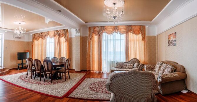 - Suite (52 sq. m.) consists of a bedroom and a living room. As an extra bed is used sofa bed. There are two spacious furnished balconies. The bathroom is combined, a bath with a shower and a bidet is installed. The equipment includes a refrigerator and a set of dishes.