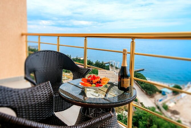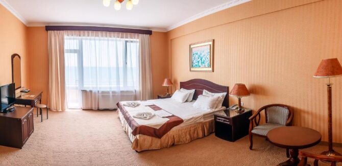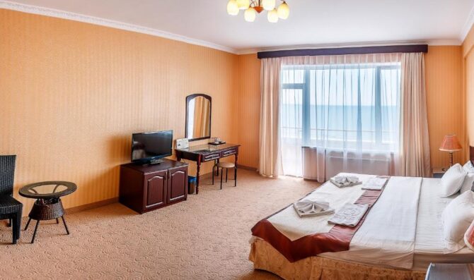- Junior Suite (26 sq. m.) is a one-room suite for two people with the possibility of two additional seats on folding armchairs. Spacious balcony (8 sq. m)) is furnished and offers sea views. The room has a dressing table with a mirror, a guest corner with semi-seats and a table.