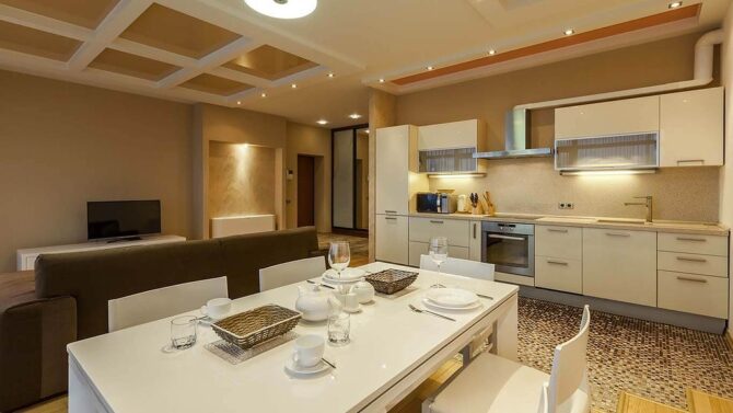 Presidential apartment of 120 m2 has 3 bedrooms, living room, 2 bathrooms and is designed to accommodate 6-8 people.